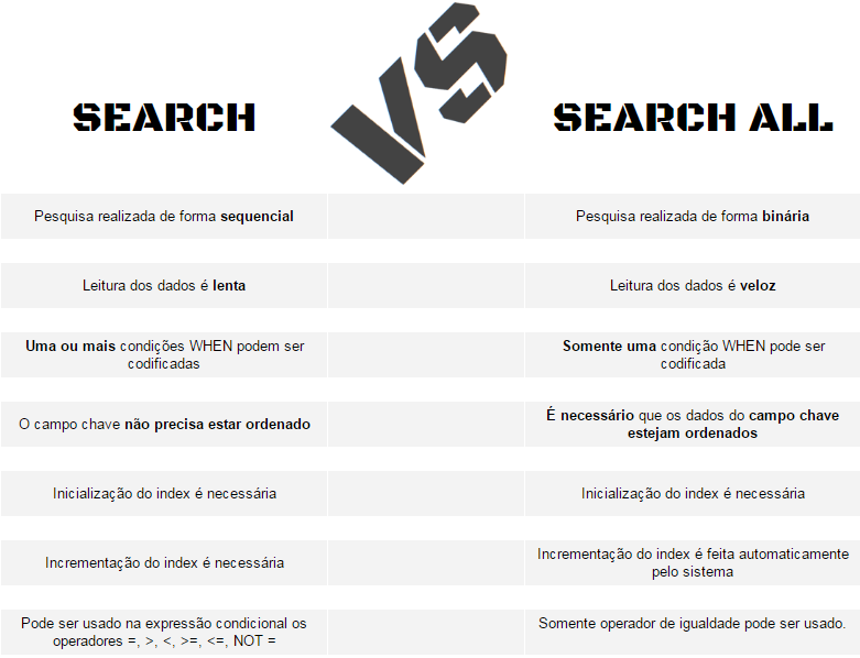 Mas lembre-se das características de cada um, pois a maior diferença está no processamento dos dados e não na escrita do comando. Também, na se esqueça da devida atenção ao se utilizar o SEARCH ALL, tanto na lista a ser processada como na declaração da tabela.